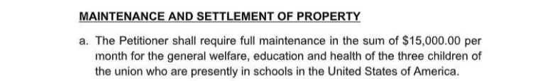 “Payment of a monthly maintenance sum of $15,000.00 (US Dollars) for the general welfare, education and health of the three children of the union who are presently in schools in the United States of America until they are of age.”